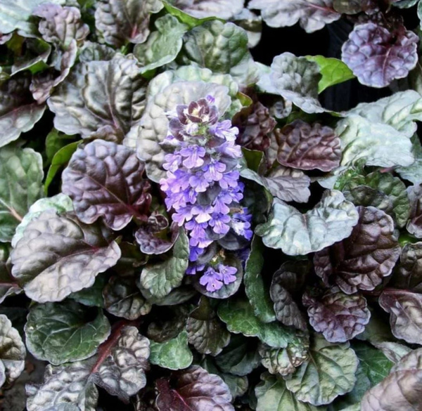 Живучка ползучая «Блэк Скэллоп» — эффектное почвопокровное растение высотой 7 см.Образует плотные глянцевые «ковры» темно-пурпурного цвета. В мае-июне покров становится синим от обилия цветков. Активный рост живучка проявляет после цветения — растение выпускает побеги-плети с новыми молодыми розетками